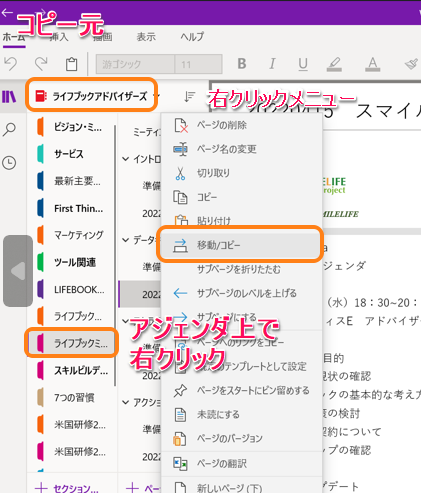 コピーの方法:①アジェンダ名上で右クリック・【移動/コピー】を選択 → ②移動先のOneNoteを選択・コピーを選択