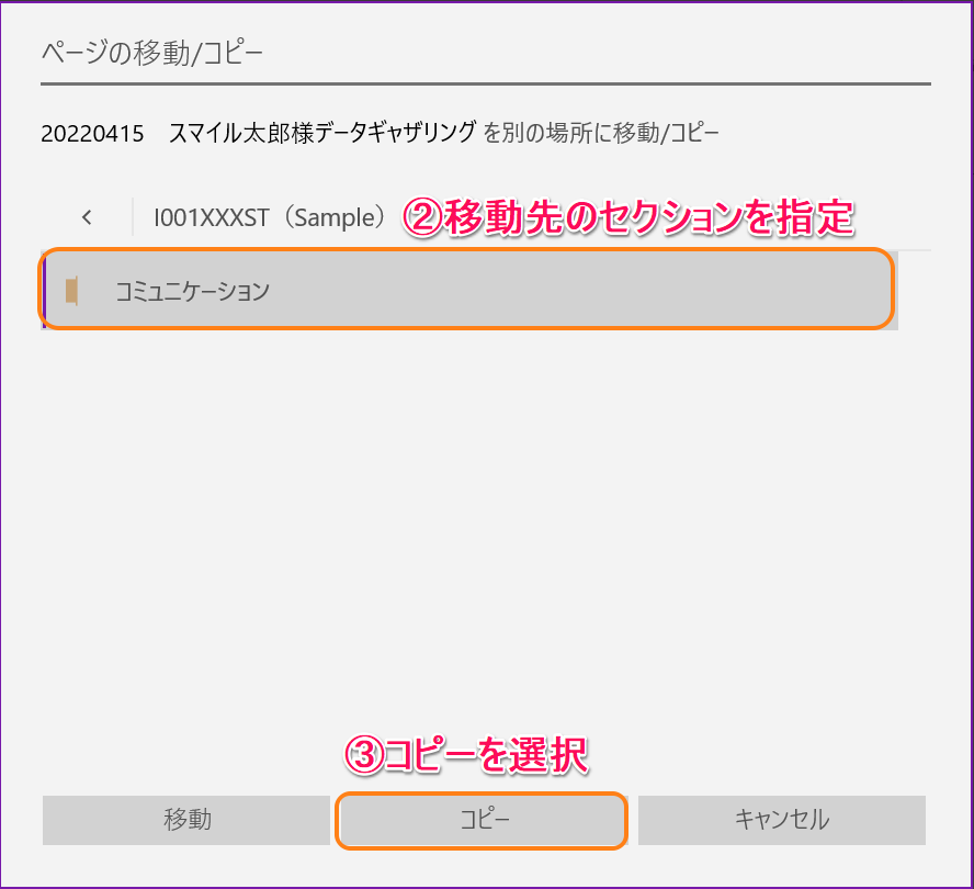 ②移動先のOneNoteを選択・コピーを選択