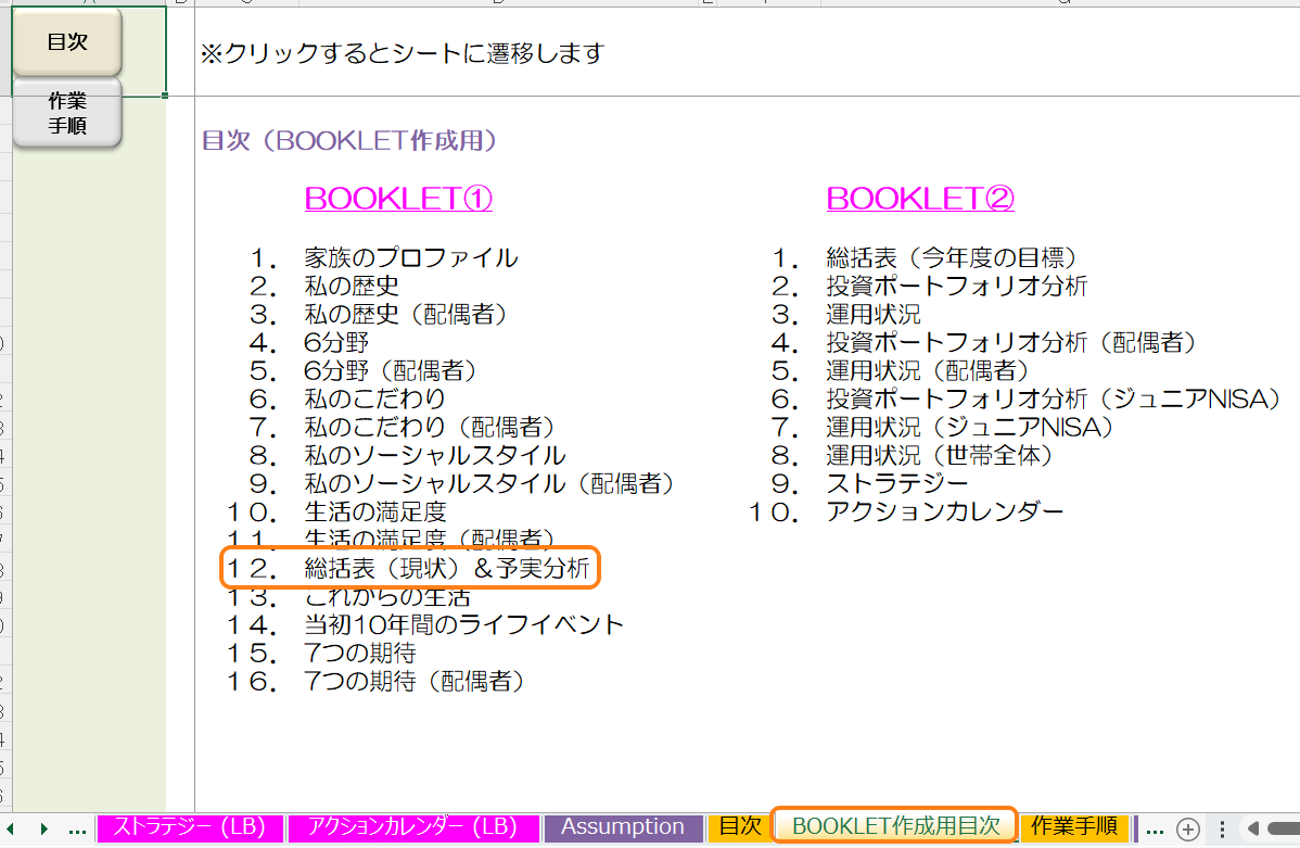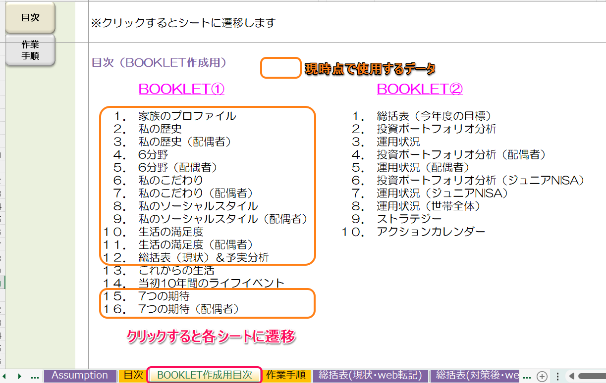 BOOKLET作成用目次から各シートに遷移